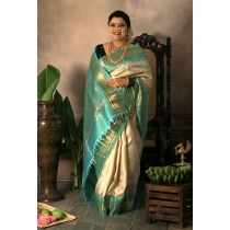 This elegant cream and blue Pure Silk Kuttu Gadhwal saree features intricate golden zari detailing, with a floral motif pallu—perfect for weddings, festive events, and cultural occasions.