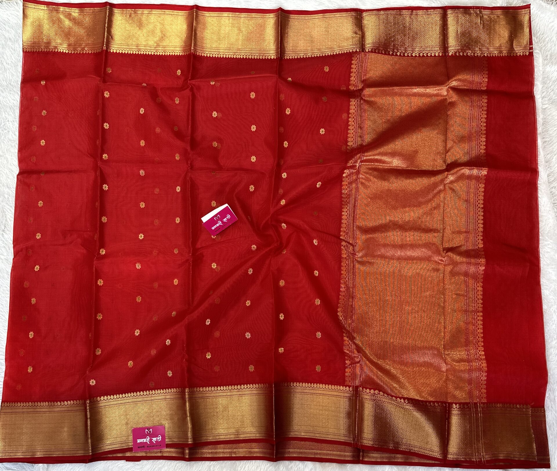 These are Chanderi sarees. They are a little stiff in texture. These are pure Chanderi sarees. The blouse piece comes in running, and the total saree length is 6.20 meters. If the saree border is in contrast, then the blouse piece also comes in contrast.