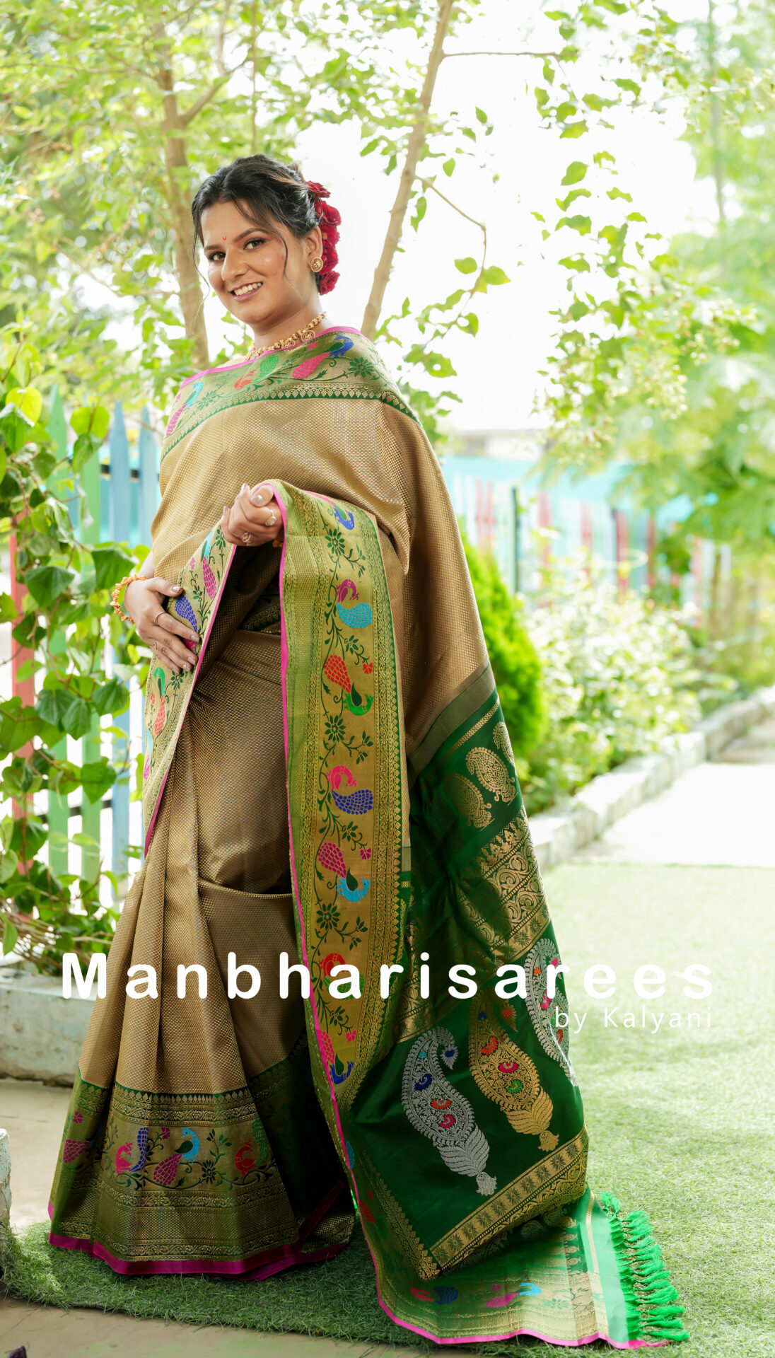 Elevate your ethnic wardrobe with this Gold Tissue Gadhwal Saree from Manbhari Sarees by Kalyani—a symbol of classic elegance blended with artistic craftsmanship. The shimmering golden body is complemented by an enchanting green and pink peacock motif zari border and pallu. The intricate detailing and traditional patterns make it a perfect pick for weddings, festive occasions, and cultural events.