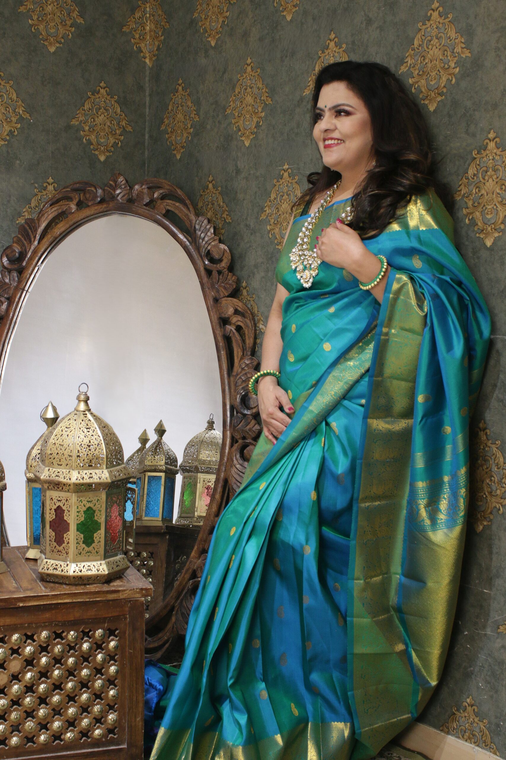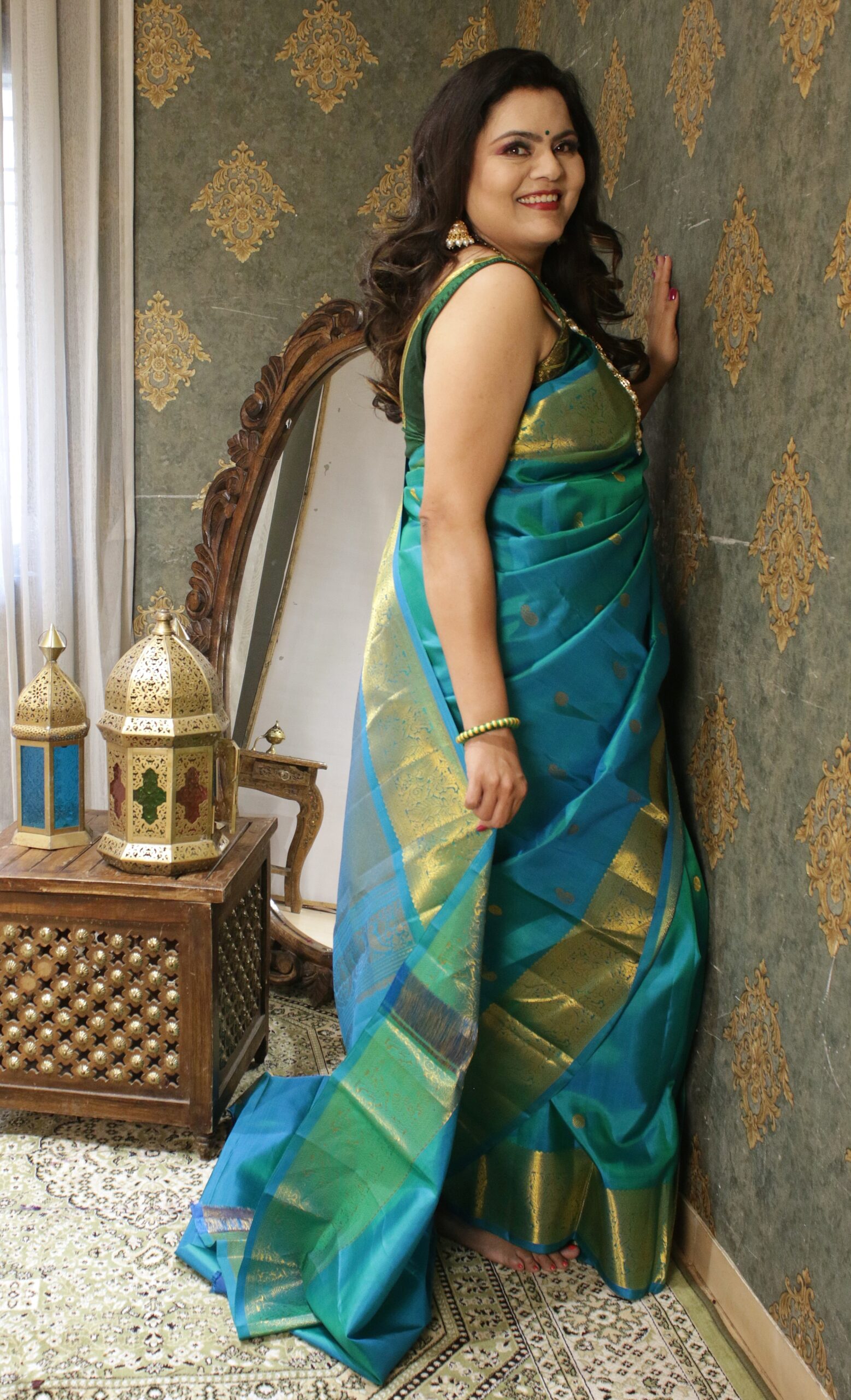 Saree Colour: Bright Aqua Blue with subtle Golden Buttis and dual-tone Royal Blue and Leaf Green with rich Gold Zari weave on border & pallu.