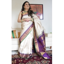 Its shimmering zari patterns and soft yet rich drape make it a preferred choice for festive occasions, weddings, and temple functions.