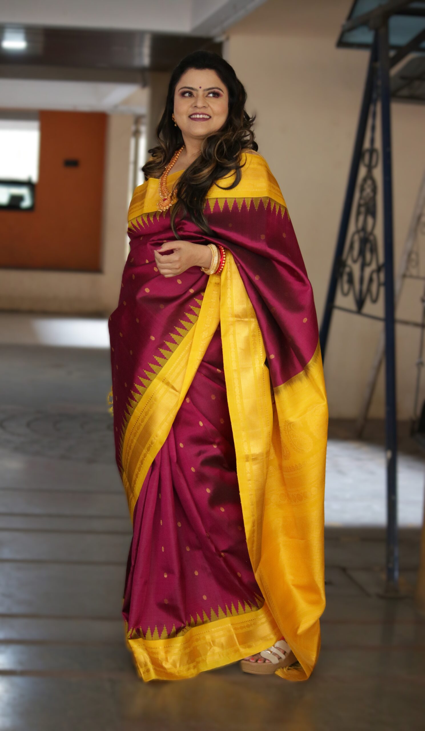 Saree Colour: Deep royal maroon body exquisitely paired with a mustard yellow border and pallu with intricate golden zari.