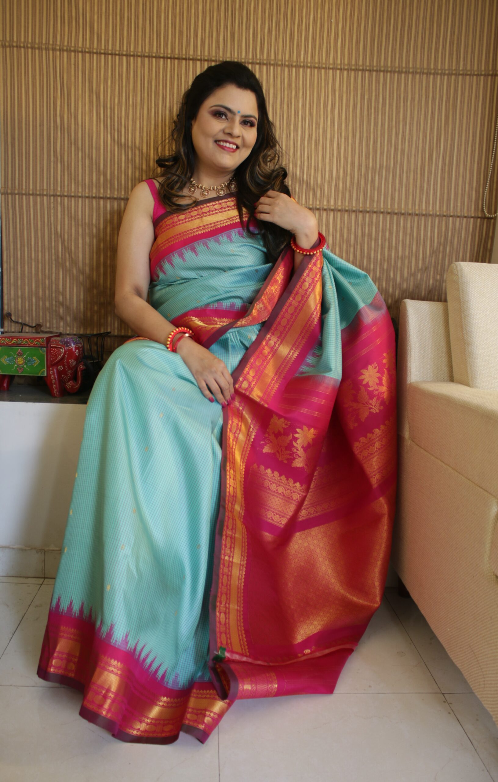 Saree Colour: Serene seafoam blue body elegantly contrasted with a radiant magenta and rich gold zari-woven border and pallu.