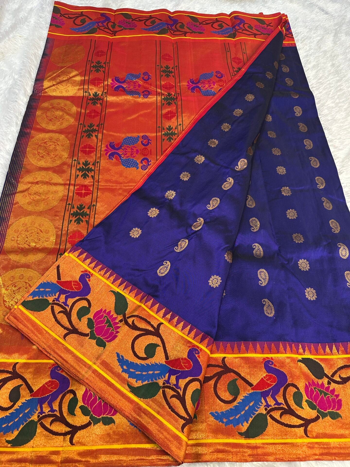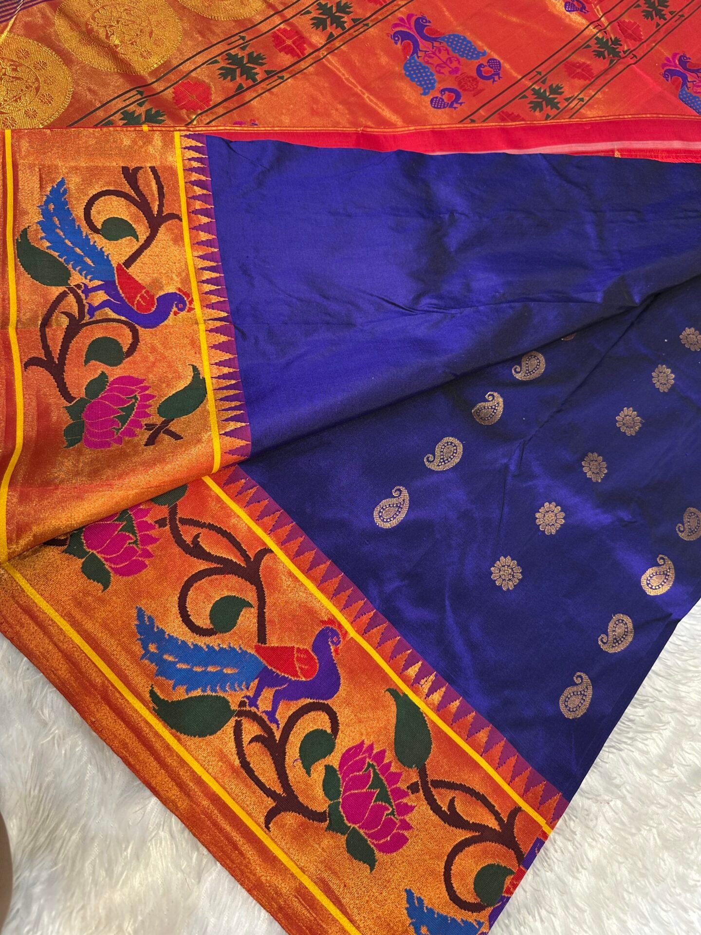 blue paithani with golden butti and a rich peacock-woven border