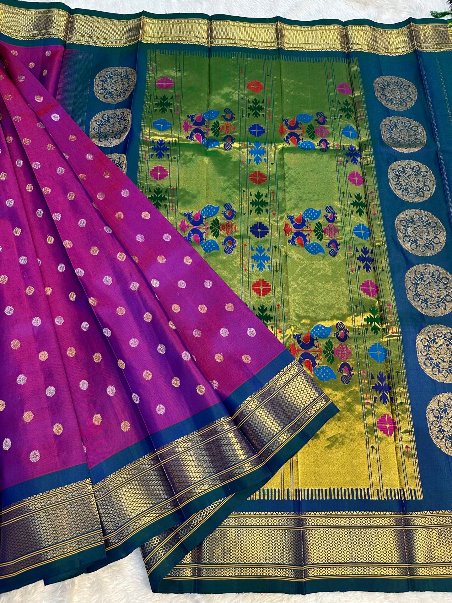 This is a South-made Paithani saree, crafted in South India and popularly known as Kalanjali Paithani.