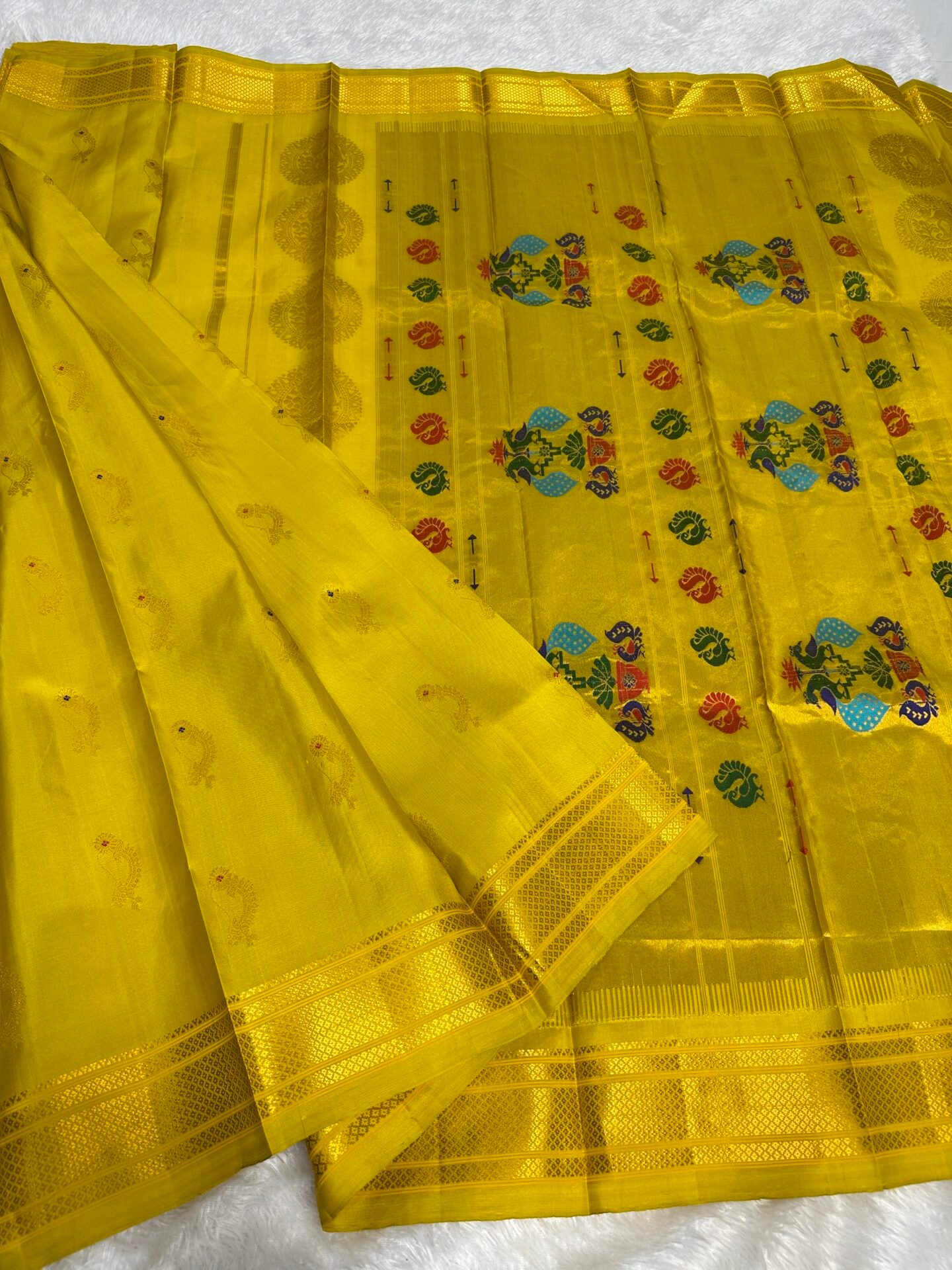 A radiant yellow Paithani silk saree with a serene sky blue body, adorned with golden zari buttas and a traditional multicolor peacock pallu—perfect for festive occasions and weddings.