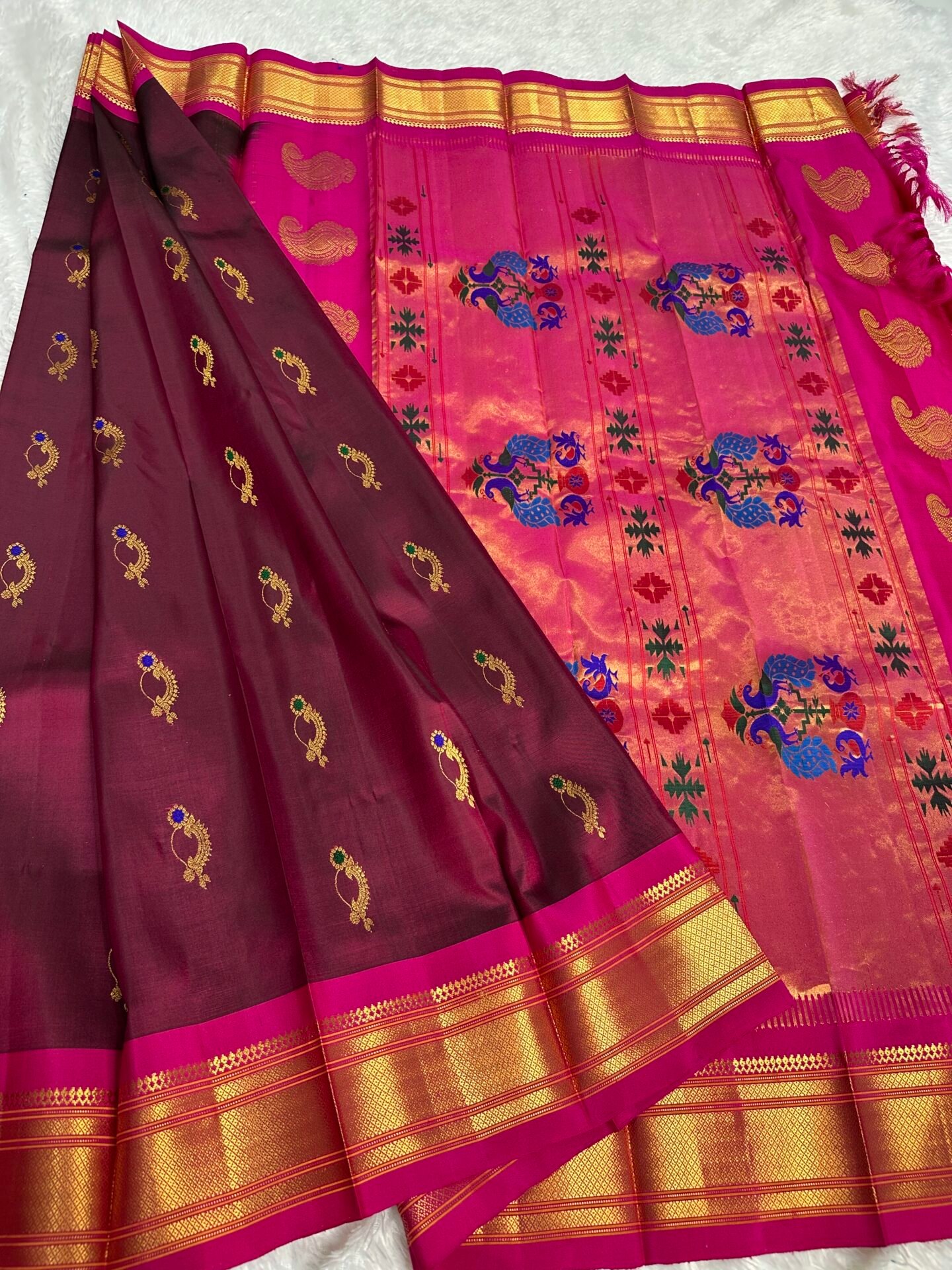 A vibrant fusion of magenta and blue, this Paithani silk saree is adorned with gold zari buttas and a richly woven peacock-floral pallu—perfect for traditional celebrations and festive wear.