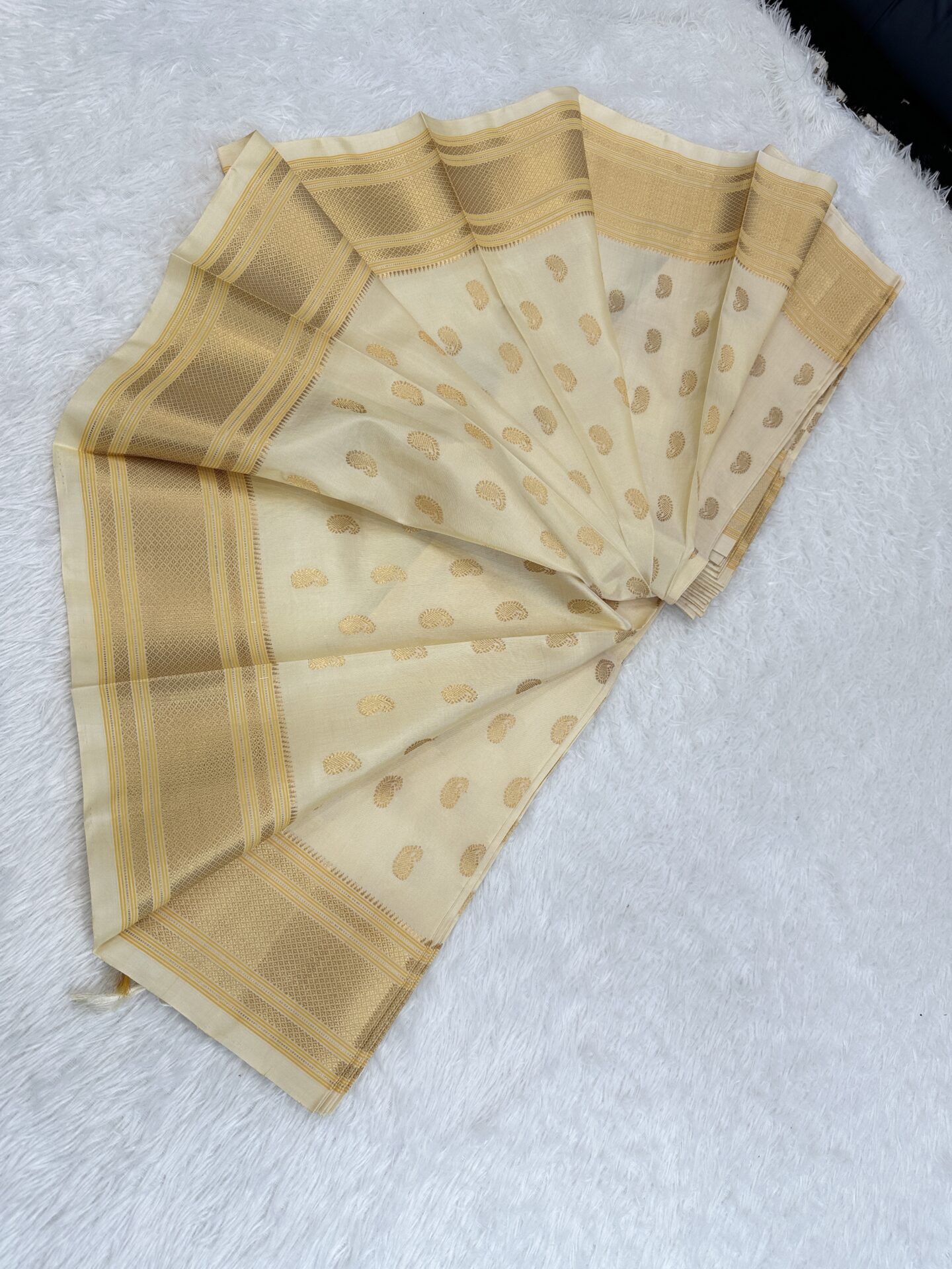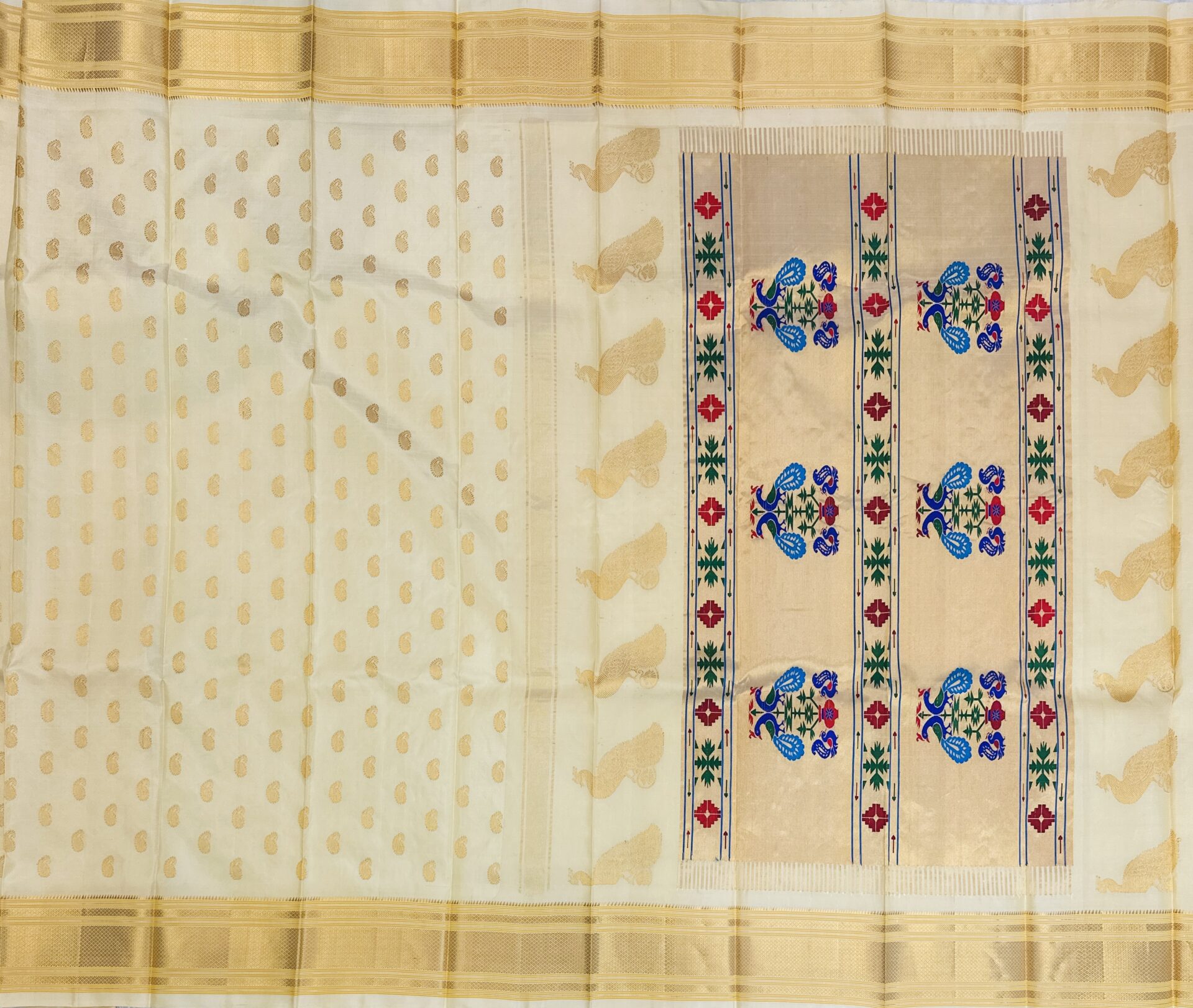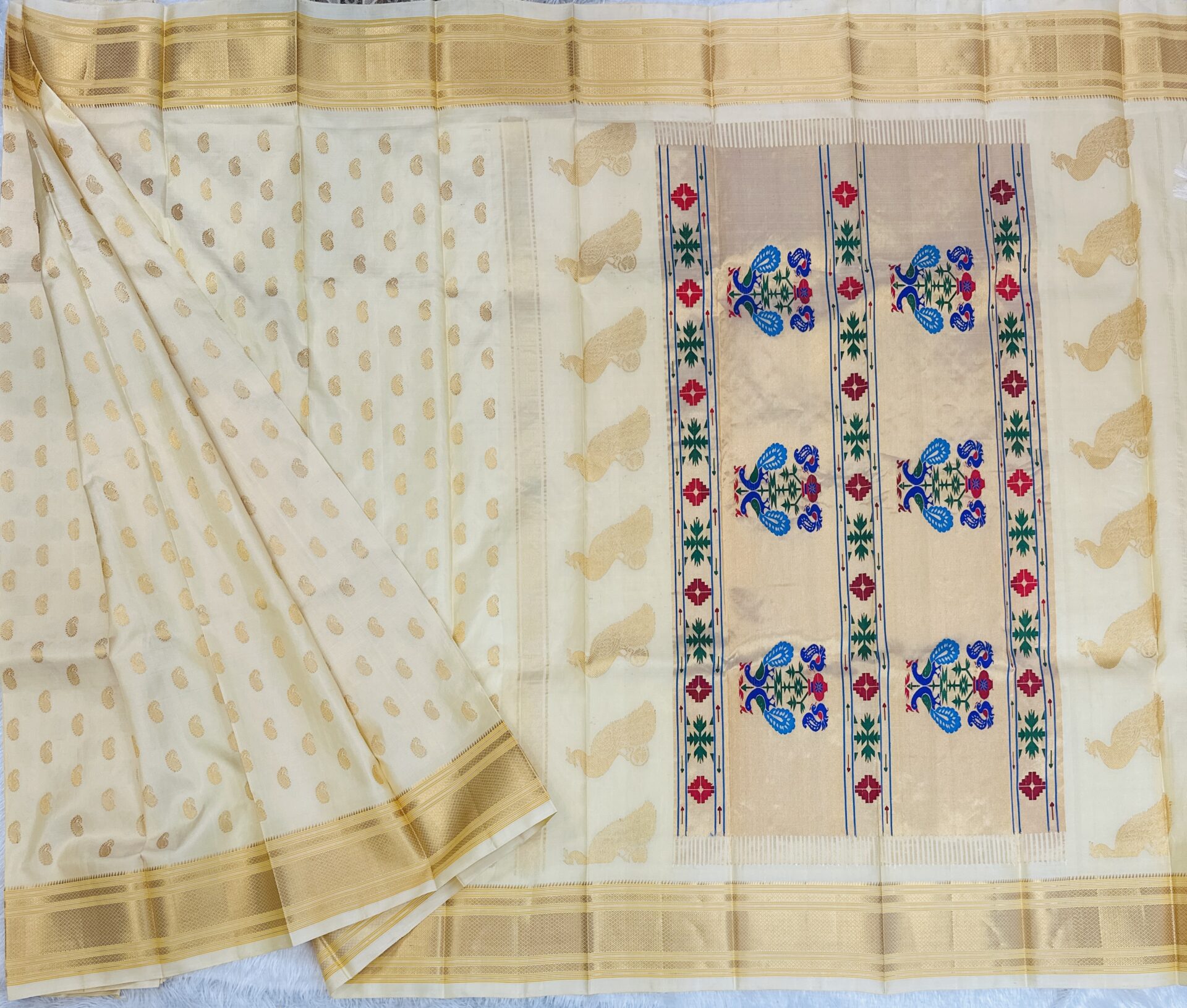 A graceful Paithani silk saree in off-white with golden undertones, adorned with a classic zari border and colorful floral pallu — an elegant choice for festive and traditional wear.