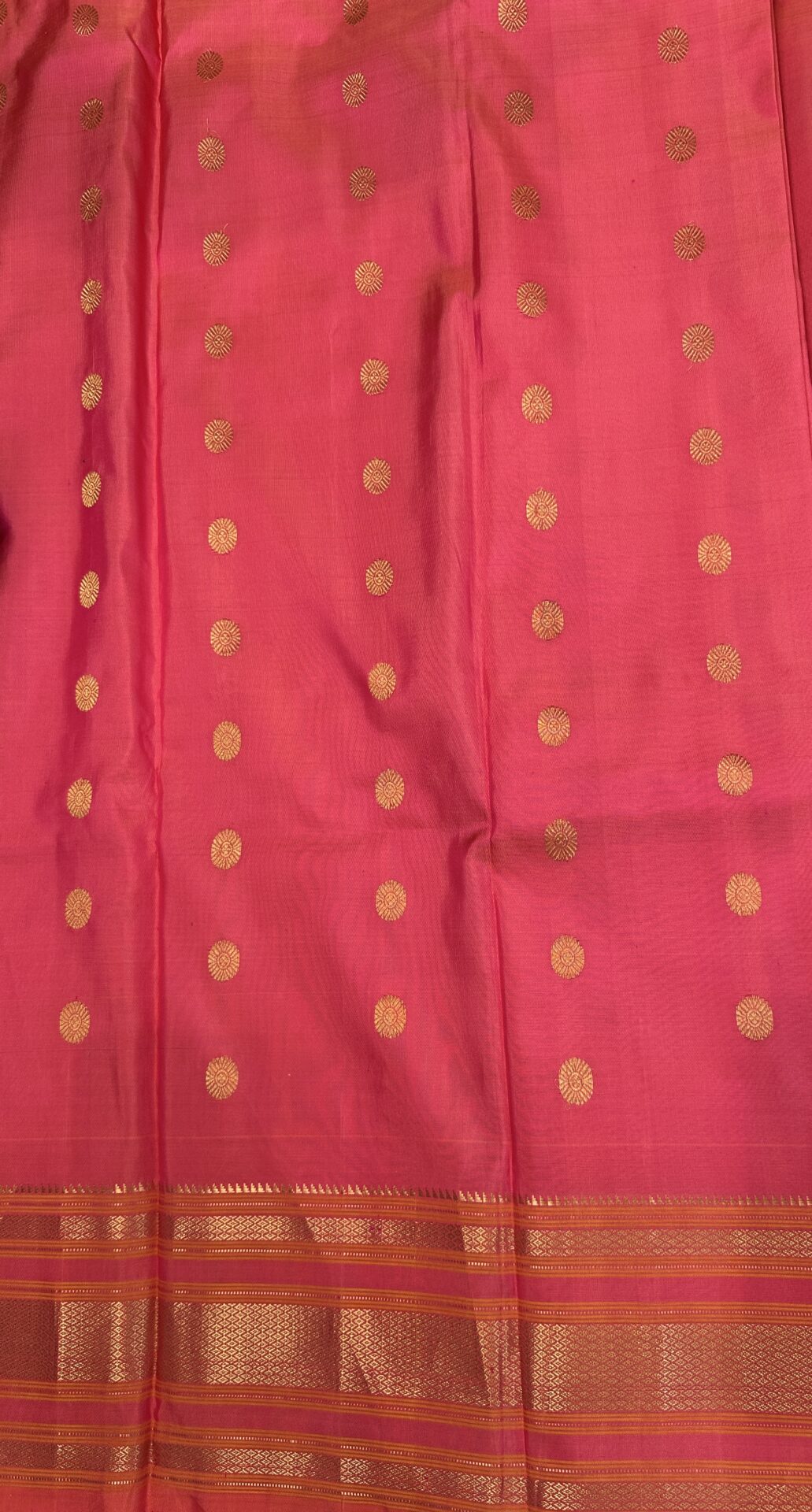 This vibrant Paithani saree in rich pink and orange hues with traditional golden zari work and a multicolor peacock pallu is a heritage masterpiece—perfect for festive celebrations and weddings.