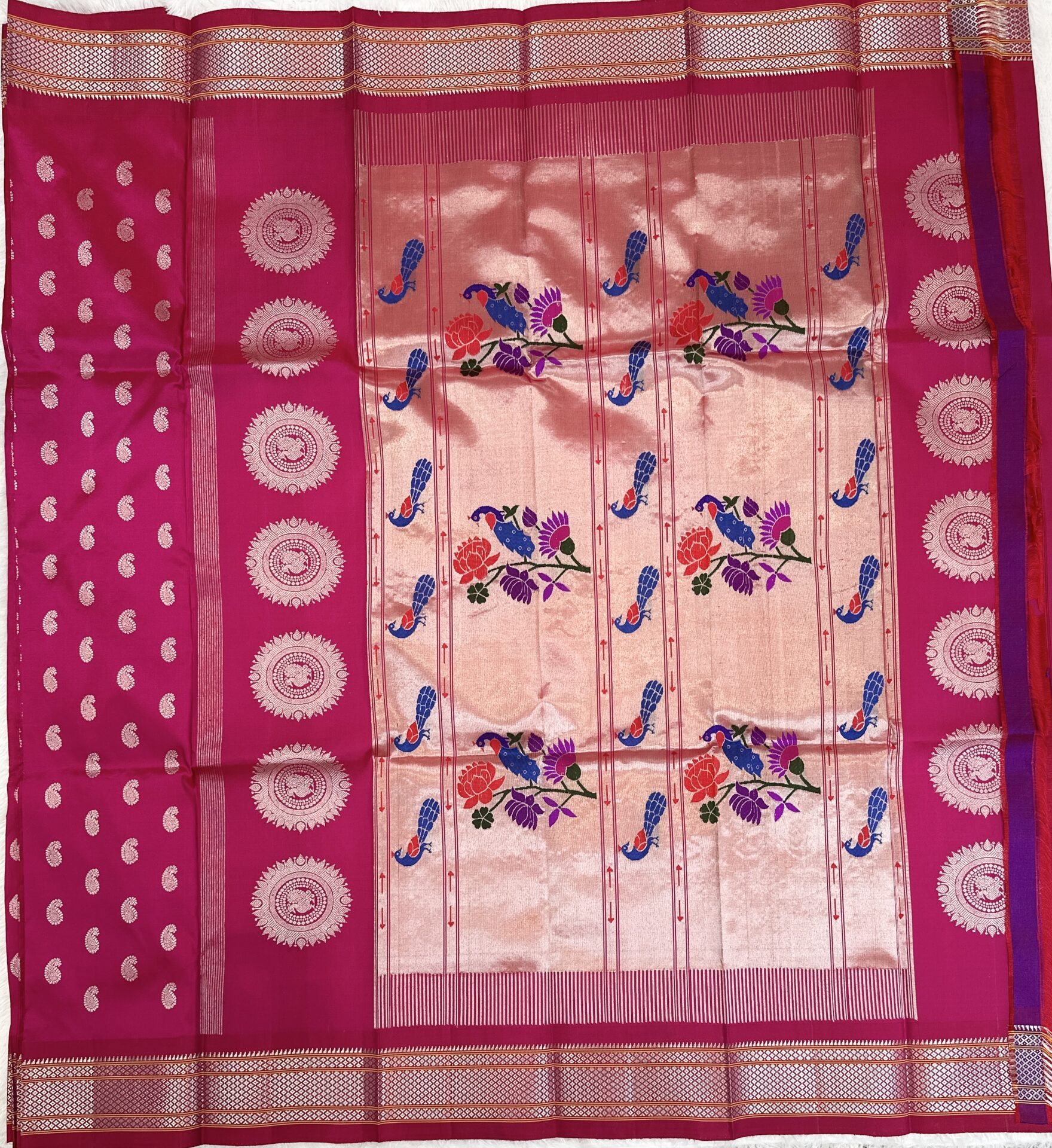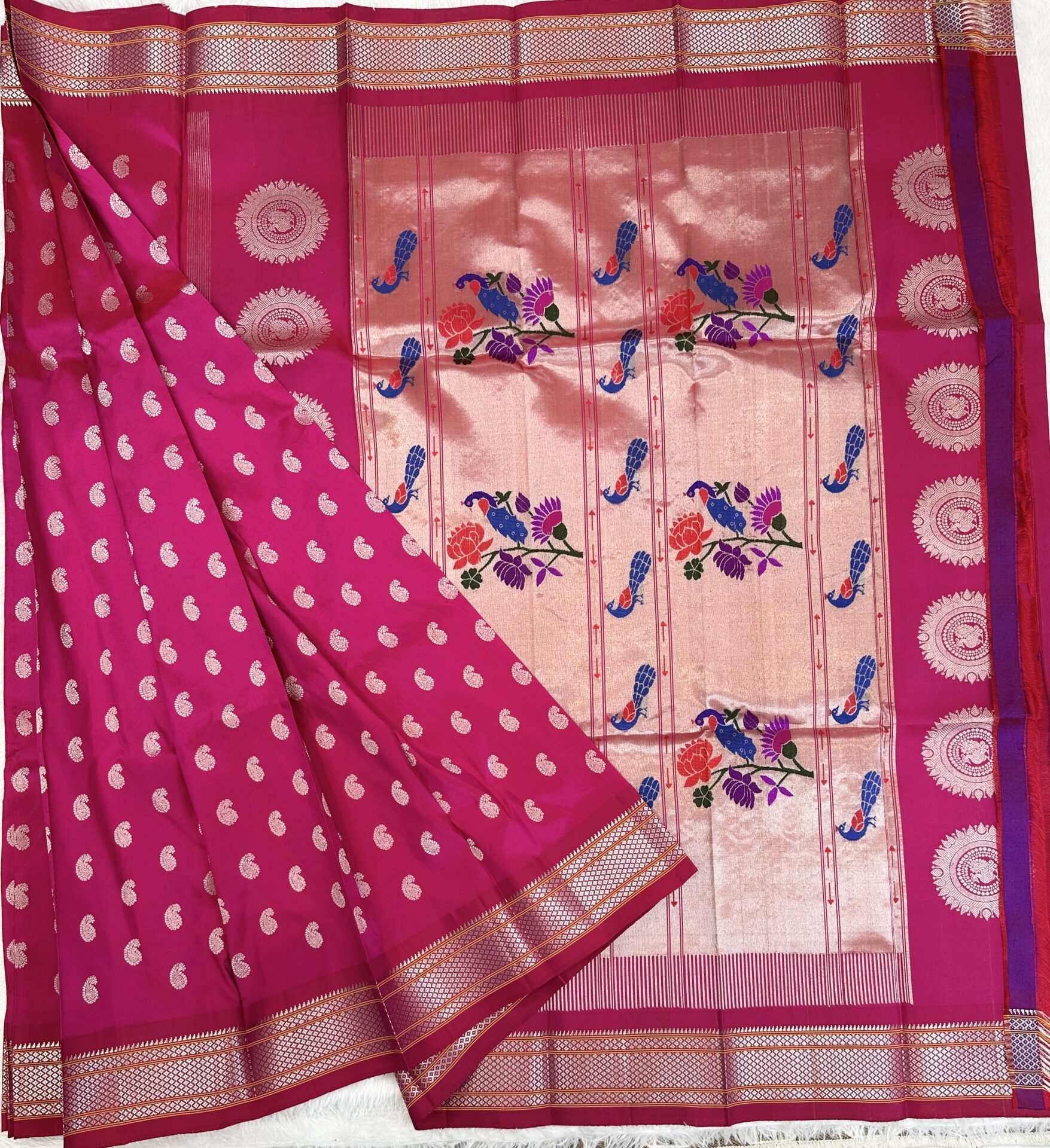 This vibrant Paithani saree in rich pink and orange hues with traditional golden zari work and a multicolor peacock pallu is a heritage masterpiece—perfect for festive celebrations and weddings.