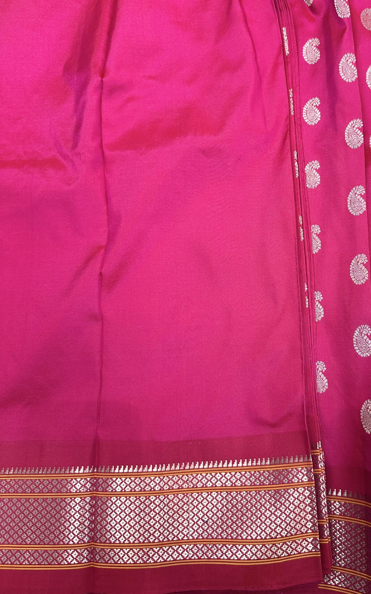 A classic yellow and pink Paithani saree in pure silk, handcrafted with floral motifs and a golden zari pallu. Ideal for weddings and special occasions.