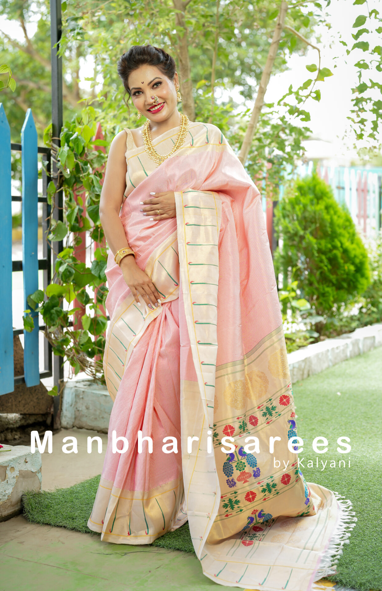 Soft Pink Paithani Silk Saree with Golden Border and Floral Pallu