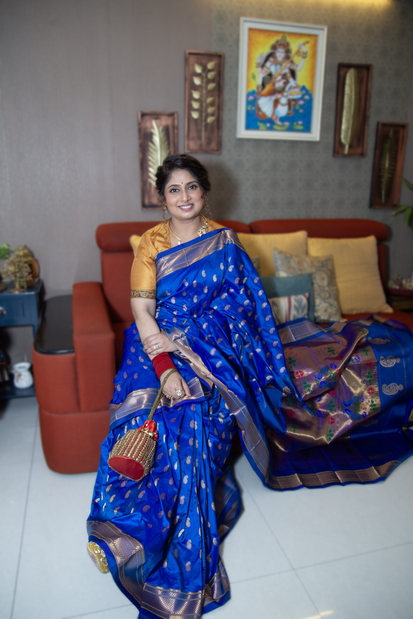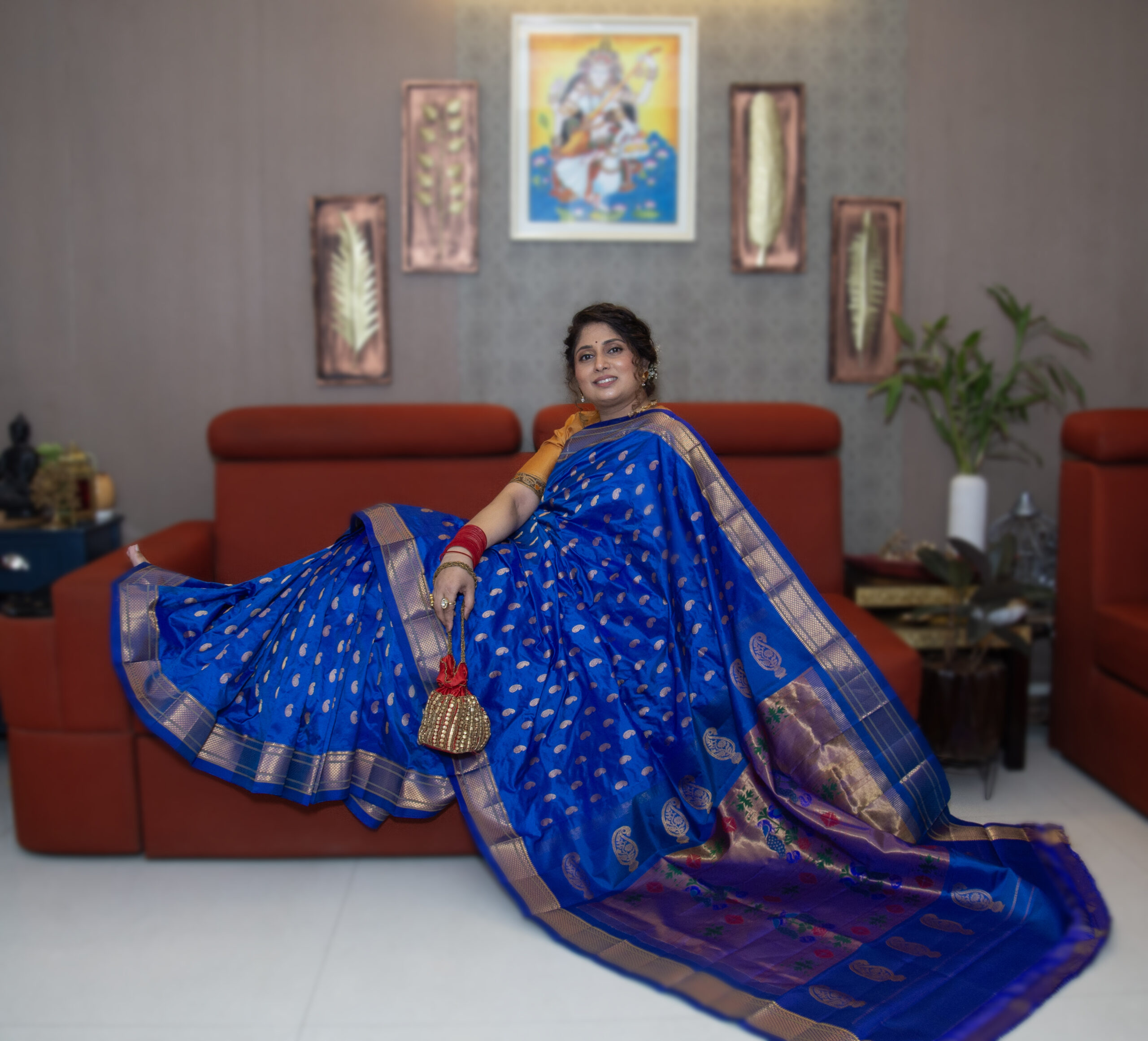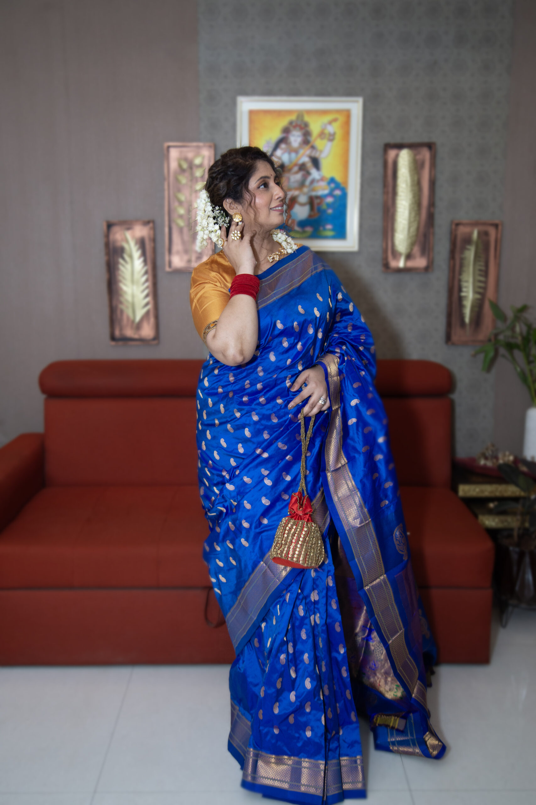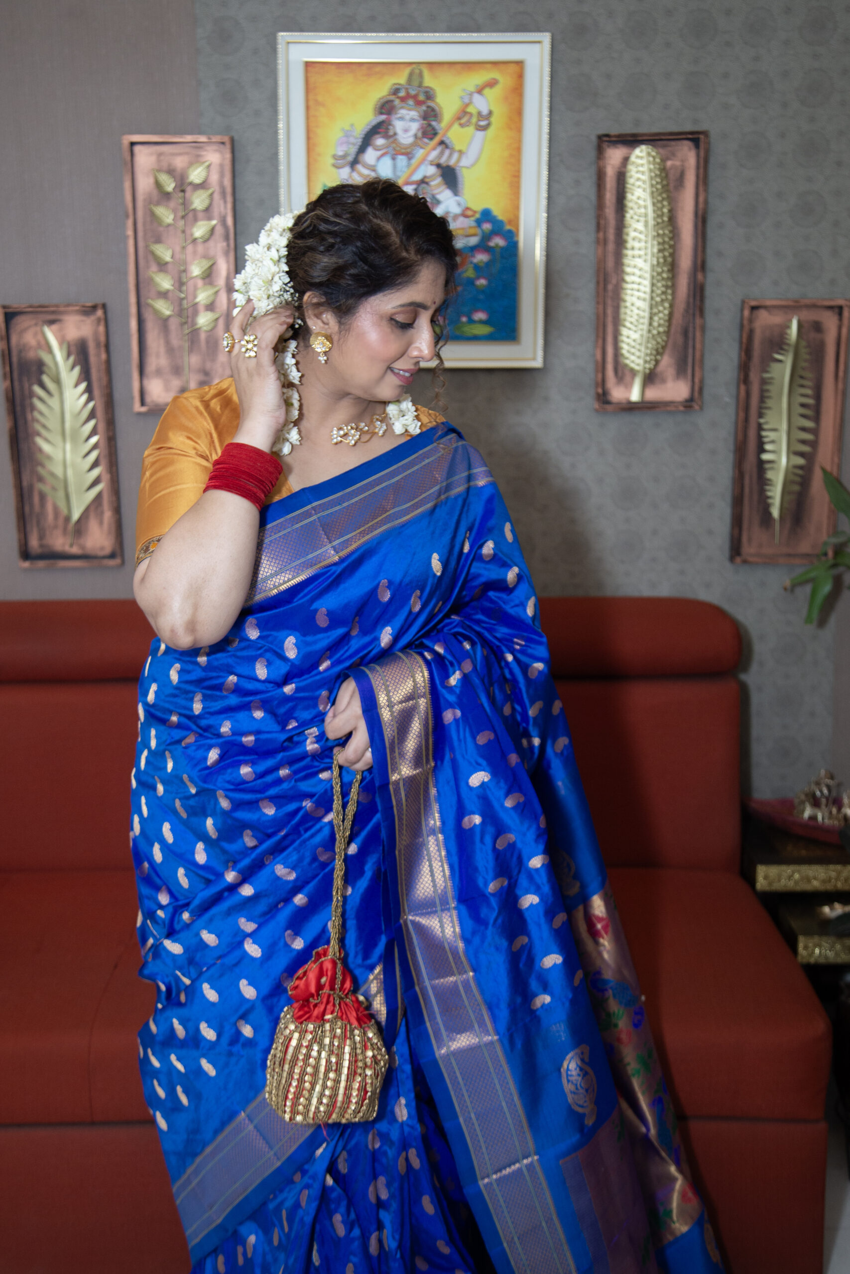 This royal blue Paithani silk saree with golden zari buttas and a parrot green pallu featuring classic peacock motifs brings together timeless elegance and festive grandeur—perfect for weddings and cultural occasions.
