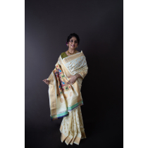 A graceful Paithani silk saree in off-white with golden undertones, adorned with a classic zari border and colorful floral pallu — an elegant choice for festive and traditional wear.