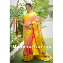 A classic yellow and pink Paithani saree in pure silk, handcrafted with floral motifs and a golden zari pallu. Ideal for weddings and special occasions.