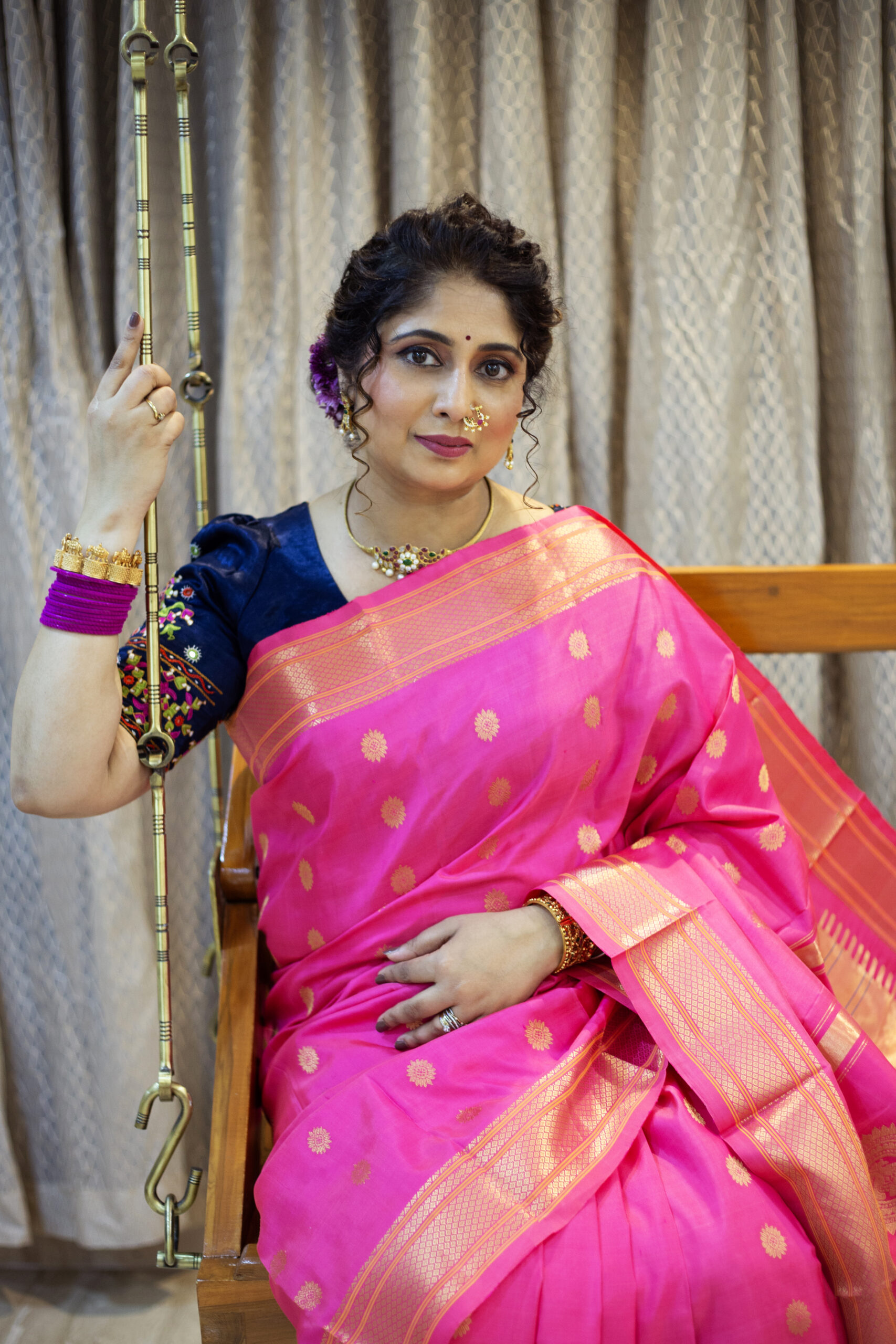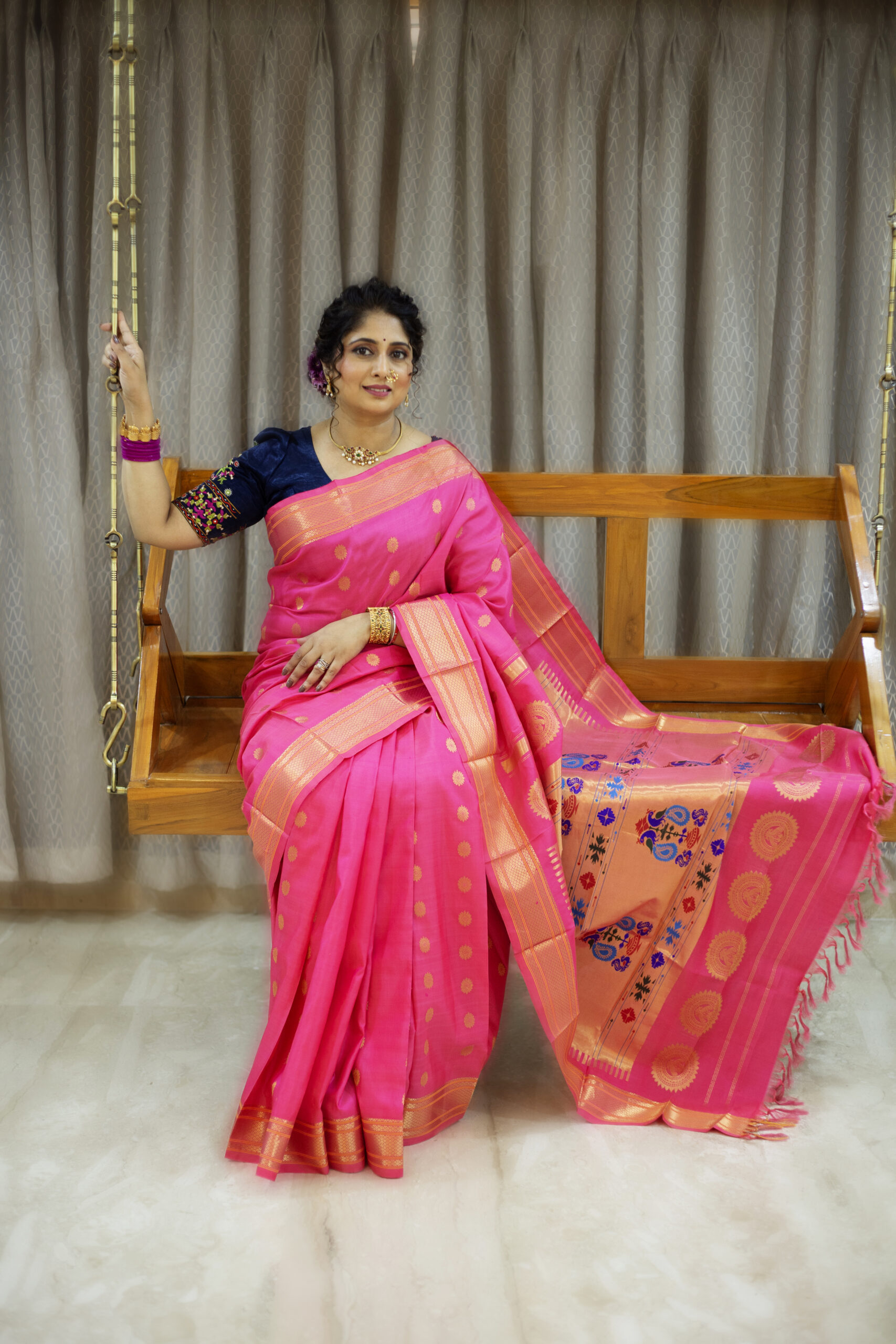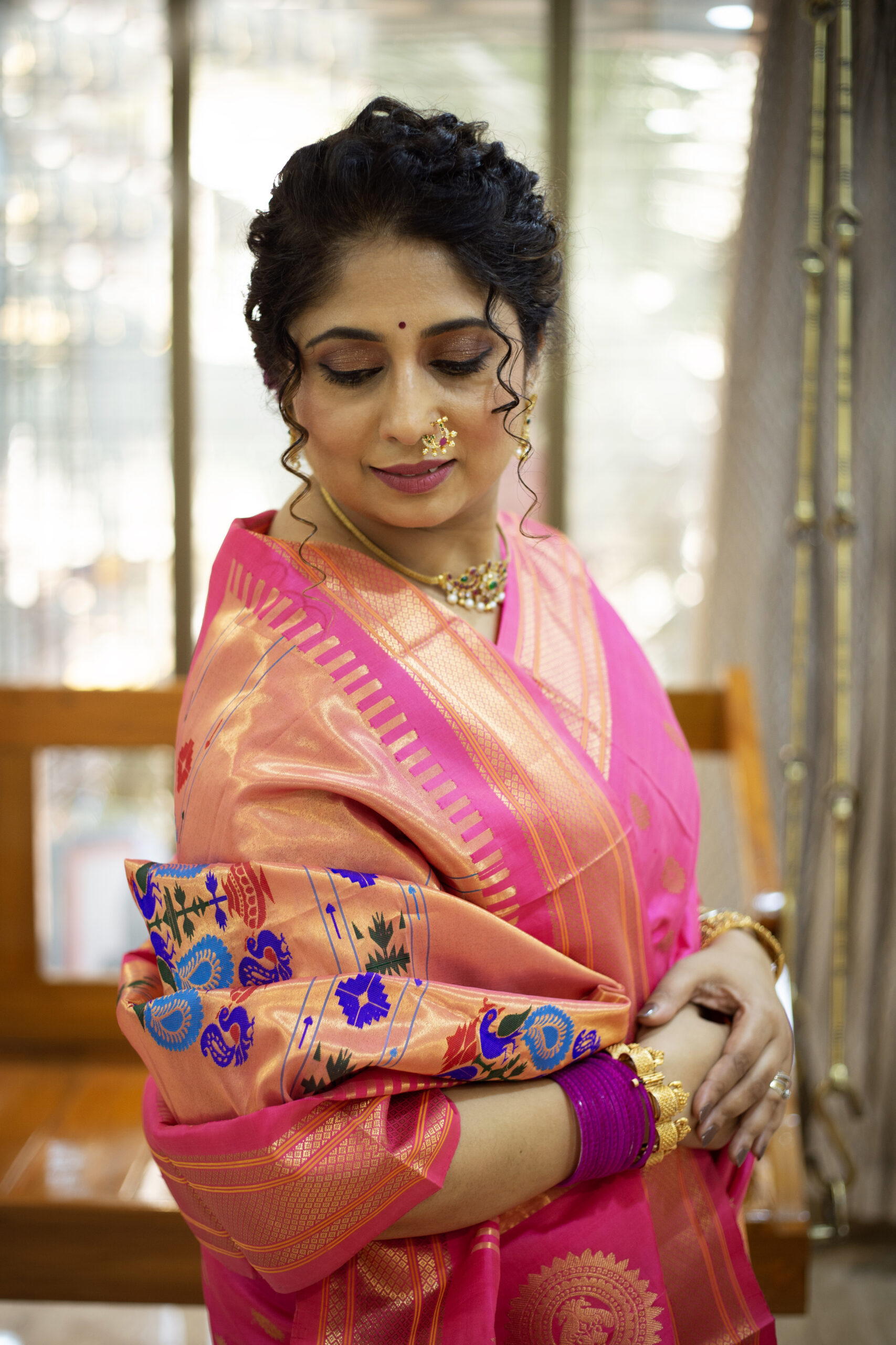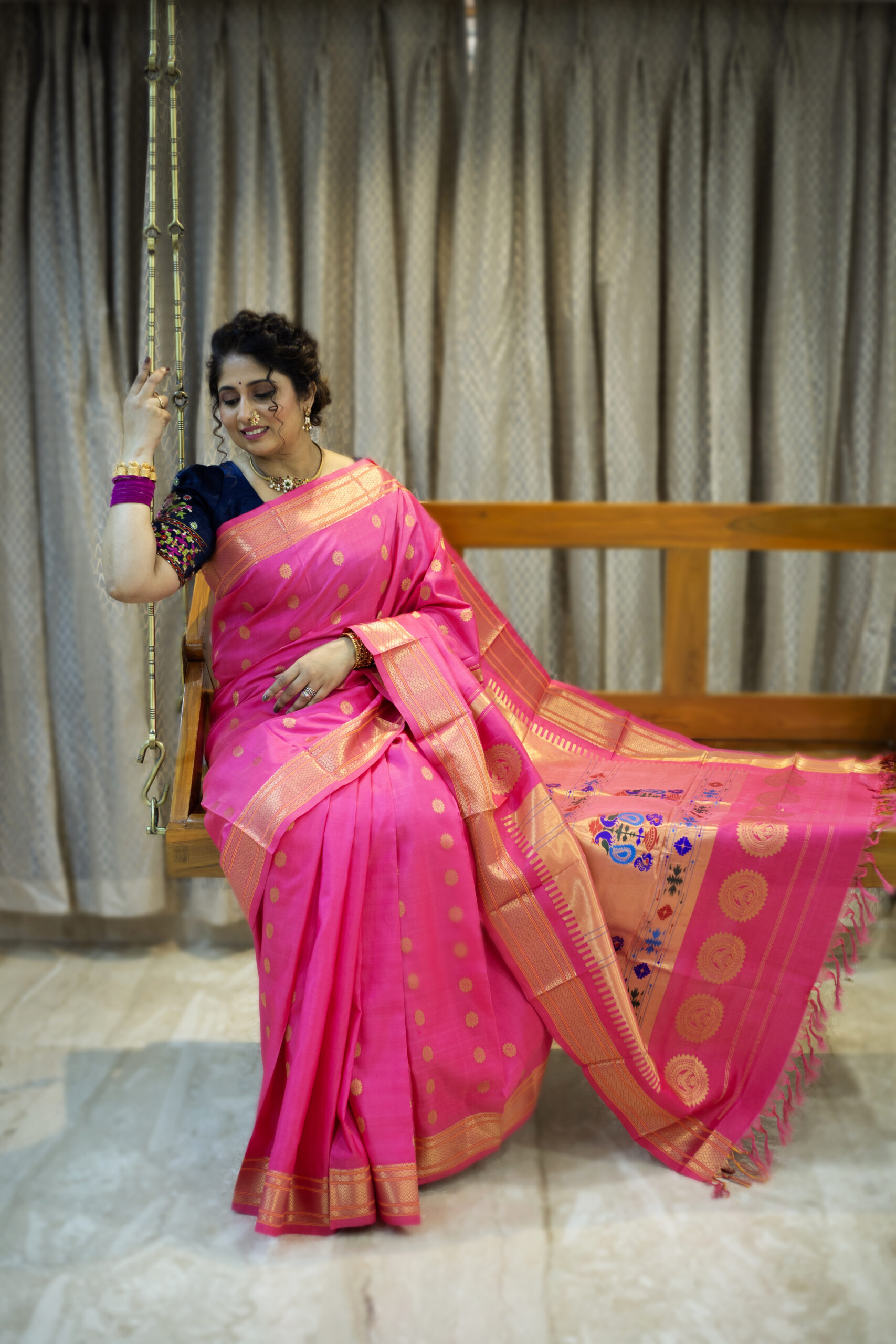 Vibrant pink and orange Paithani silk saree adorned with intricate peacock motifs and a rich zari border — a timeless Maharashtrian heritage piece.