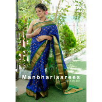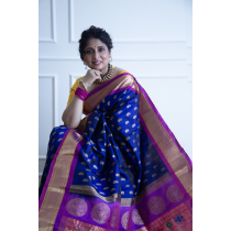 This royal blue Paithani silk saree with golden zari buttas and a parrot green pallu featuring classic peacock motifs brings together timeless elegance and festive grandeur—perfect for weddings and cultural occasions.